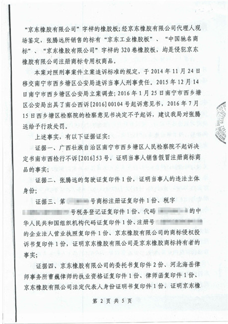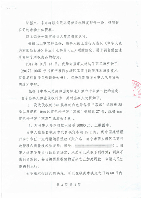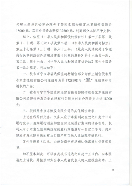截止到2018年11月份,廣西南寧西鄉塘區工商行政管理和質量技術監督局對假冒我公司商標侵權行為進行行政處罰:崔建強[西工質處字(2017)1065號] 10000元;張騰遠[西工商質監處字(2018)1312號] 75500元。全部上繳國庫。并對這兩起案件我公司也進行了司法賠償判決。